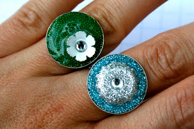 Jen has been obsessed with Mod Podge Dimensional Magic lately, and I can't blame her. It's completely awesome. I made these rings, one of my favorite (and easiest) Dimensional Magic projects, and I'm going to share with you the three step tutorial.